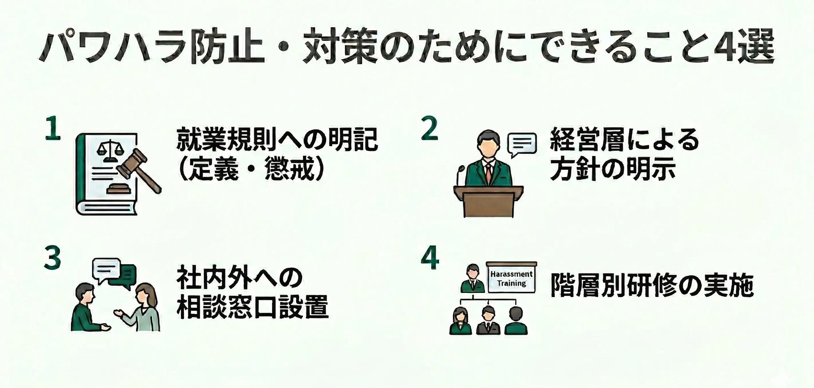 パワハラ防止・対策のためにできることは以下4つです。