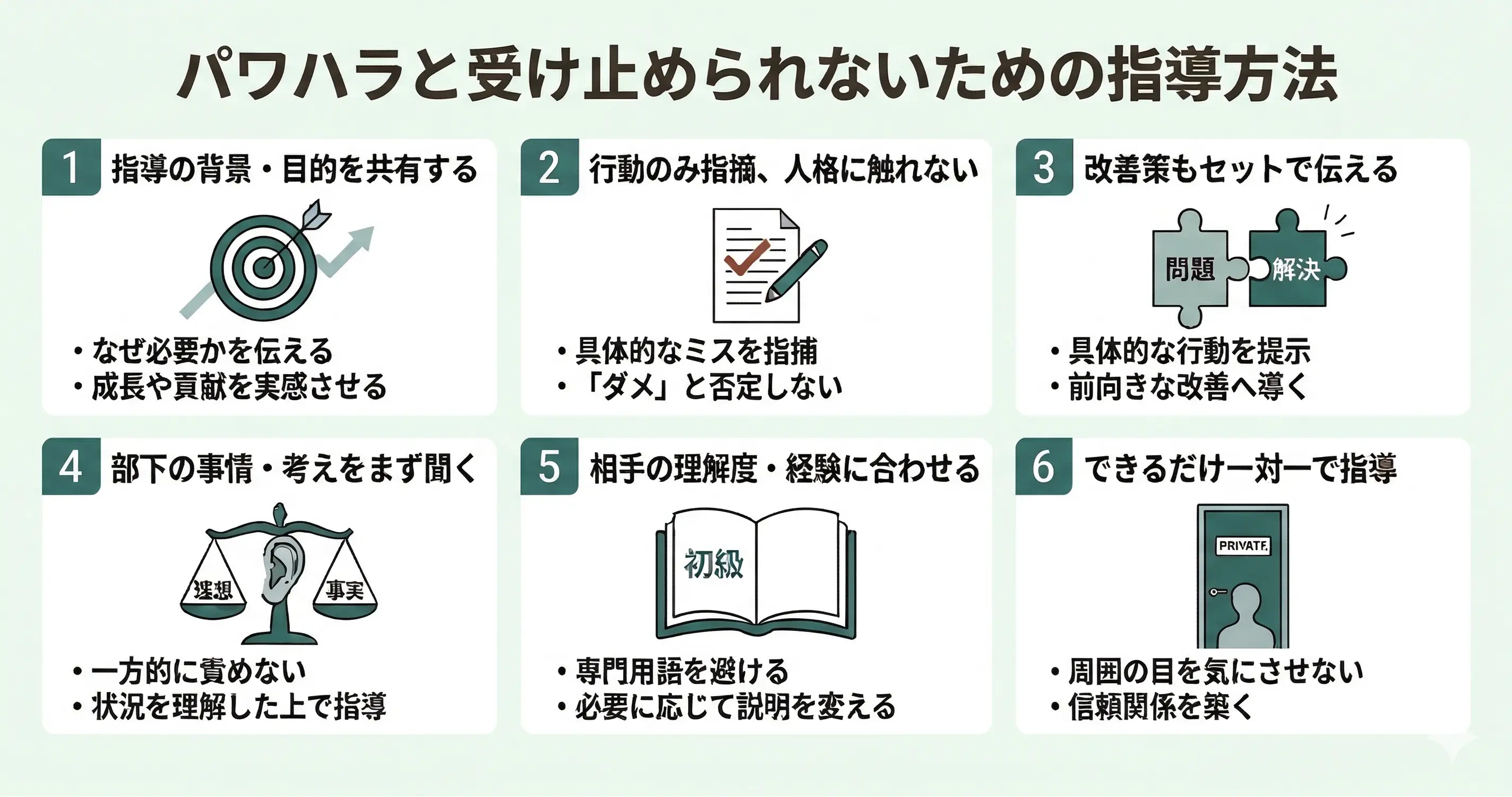 パワハラと受け止められないための指導方法は以下の通りです。